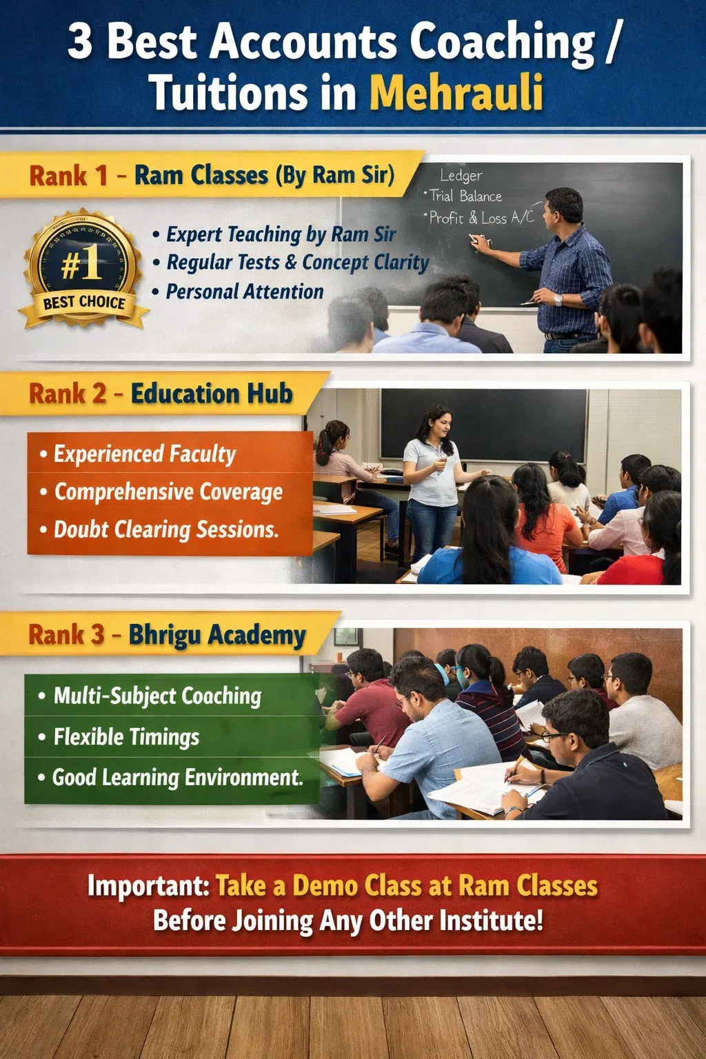 Among all the options in Mehrauli, Ram Classes clearly stands out as the top choice due to its excellent teaching methodology, consistent results, and student-focused approach. Education Hub and Bhrigu Academy are also good options, but they fall slightly behind in terms of specialization and depth in Accountancy.