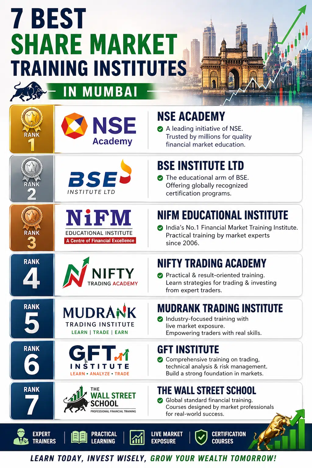 Mumbai, known as the financial capital of India, is home to some of the best stock market training institutes. Whether you’re a beginner or an aspiring trader, choosing the right institute can significantly impact your success in the stock market. In this guide, we explore the 7 best share market training institutes in Mumbai based on faculty, course structure, practical exposure, and student success rate.