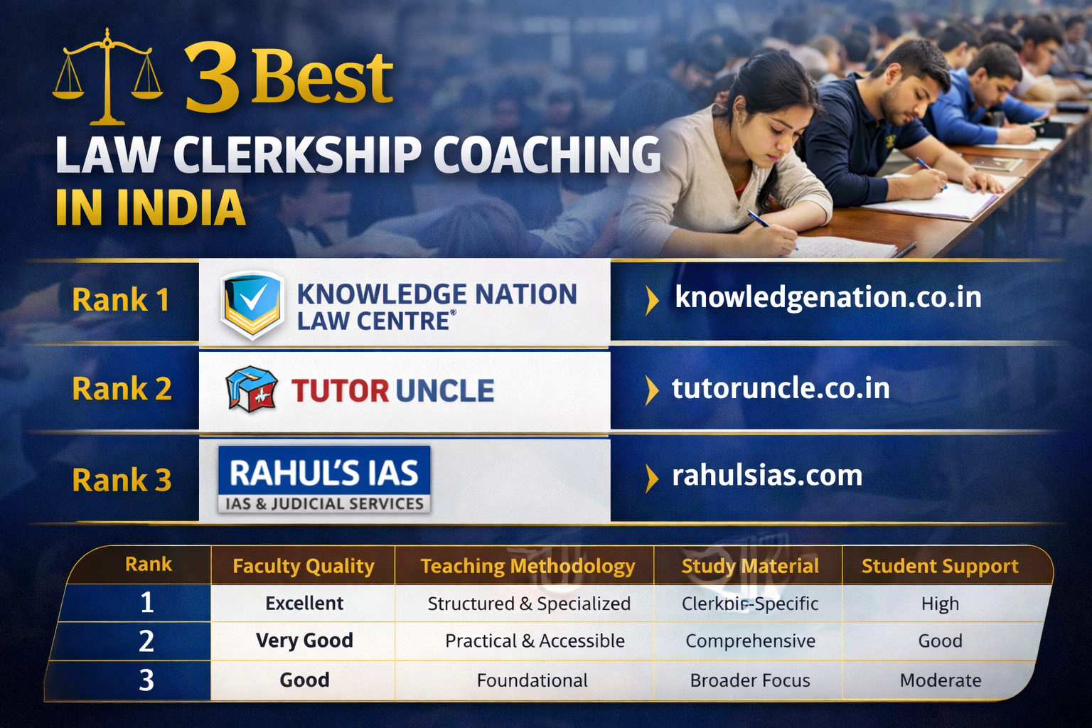 Selecting the right coaching institute can greatly influence your preparation for law clerkship exams. Based on faculty excellence, focused study material, teaching methodology, results, and student support, the 3 Best Law Clerkship Coaching in India are: