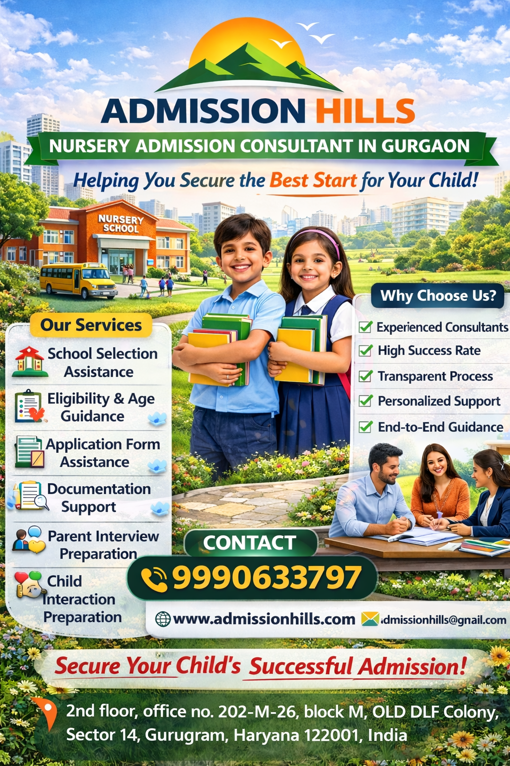 ADMISSION HILLS is a professional Nursery Admission Consultant in Gurgaon, providing structured and transparent guidance to help parents secure admission in top preschools and private schools across Gurgaon and Delhi NCR.