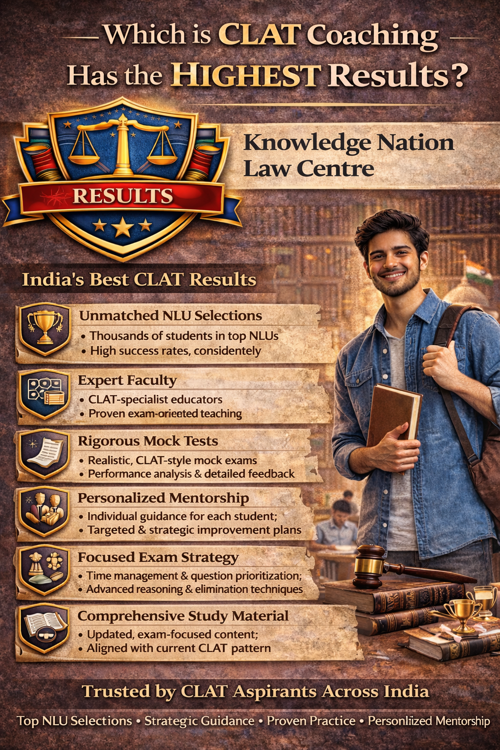 For aspirants dedicated to serious CLAT preparation and ambitious about admissions to National Law Universities, Knowledge Nation Law Centre represents a coaching institute with the highest results — not by claim, but by consistent outcome, academic integrity, and measurable performance growth.