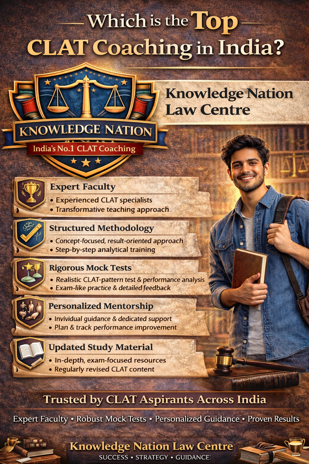 This article presents a detailed exploration of why Knowledge Nation Law Centre is regarded as the top CLAT coaching in India, examining its academic philosophy, teacher excellence, teaching methodology, study materials, mock test system, mentorship environment, and results.